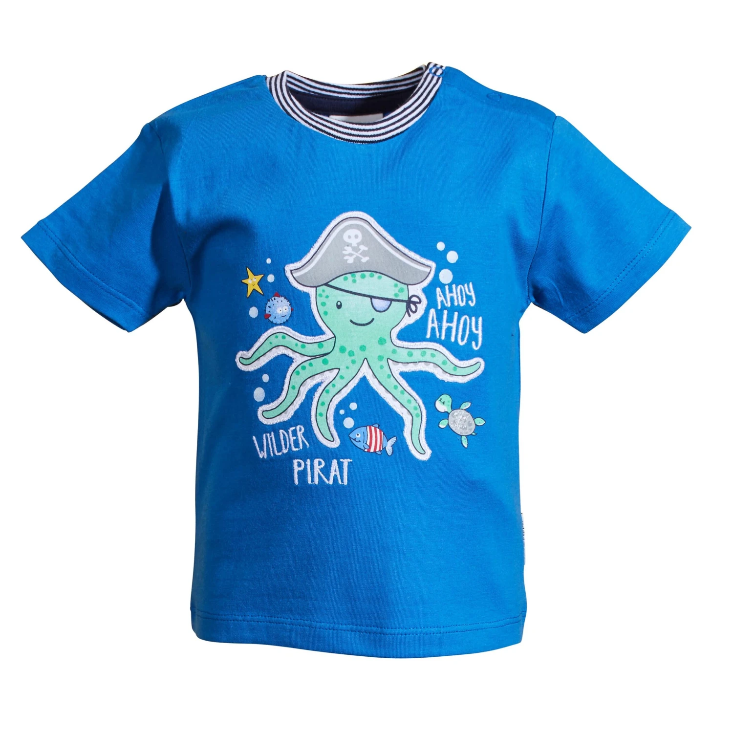 Das einfarbige T-Shirt hat viel zu bieten. Neben dem applizierten niedlichem Tintenfisch mit Piratenhut und Augenklappe, sind hier auch eine Möwe, ein Fisch, ein Seestern und eine Schildkröte zu finden. Der gestickte Schriftzug „AHOY, AHOY WILDER PIRAT “ ergänzt das süße Motiv. Ein zusätzlicher Hingucker ist der geringelte Saum am Halsausschnitt. Der bequeme Schnitt sorgt für bedingungslosen Tragekomfort in jeder Alltagssituation. Eine Druckknopfleiste auf der Schulter stellt einfaches An- und Ausziehen sicher. Artikel fällt kleiner aus. Bitte eine Nummer größer bestellen.
