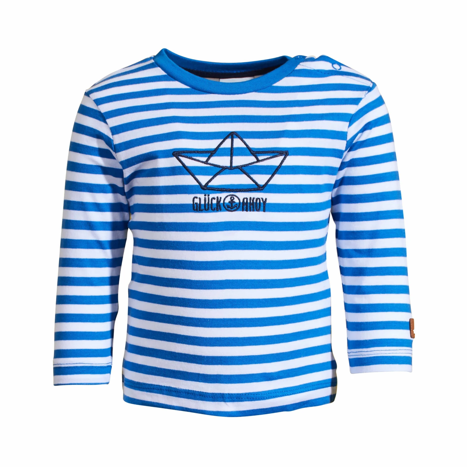 Dieses maritime gestreifte Langarmshirt von Salt & Pepper kommt mit einem Frontprint aus Stickerei selbstbewusst um die Ecke. Das Frontmotiv sticht mit einem Schriftzug „Glück Ahoy“ kontrastreich hervor und lässt die kleinen Seemanns Herzen höher schlagen. Artikel fällt kleiner aus. Bitte eine Nummer größer bestellen.