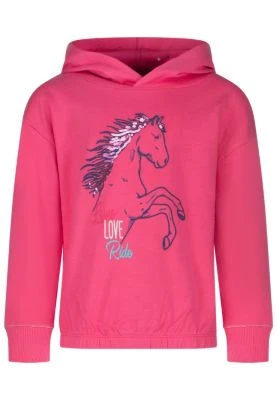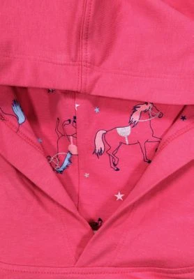 Hübsches uni farbenes Mädchen Sweatshirt von SALT AND PEPPER mit lässiger Kapuze. Eyecatcher ist das detailgetreue und gestickte Pferde Motiv in der Shirtmitte. Glitzernde Pailletten in der Pferdemähne sowie der gestickte Schriftzug „Live Love Ride“ lassen kleine Mädchenherzen höher schlagen! Das Innenfutter der coolen Kapuze ist aus einem All Over Pferdeprint. Im abschließenden Saum ist ein lockeres Gummiband eingearbeitet. Das elastische Nackenbändchen des Shirts ist mit einem farbig abgestimmten Muster bedruckt. Die weiche Fleece Qualität aus dem Baumwolle Materialmix liegt angenehm auf der Haut. Ein bequemer Artikel in tollen Mädchenfarben.