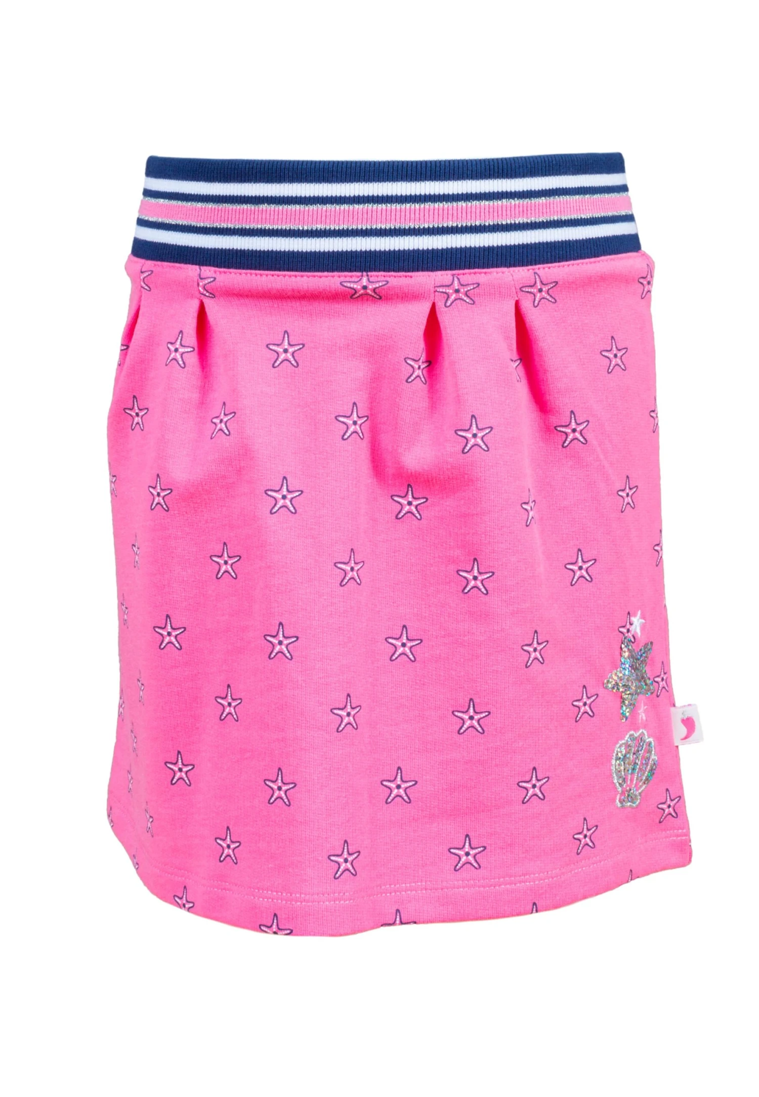 Süßer Rock für Mädchen mit allover Seestern – Print. Der Rock lässt sich durch ein breites, elastisches, gestreiftes Bündchen bequem tragen. Neben dem allover Druck befinden sich zwei kleine Applikationen in Form eines Sterns und einer Muschel an der unteren linken Seite. Die Motive bestehen aus festen und hochwertigen Pailletten. Die weiche Qualität aus Baumwolle lässt sich angenehm tragen. Artikel fällt kleiner aus. Bitte eine Nummer größer bestellen.