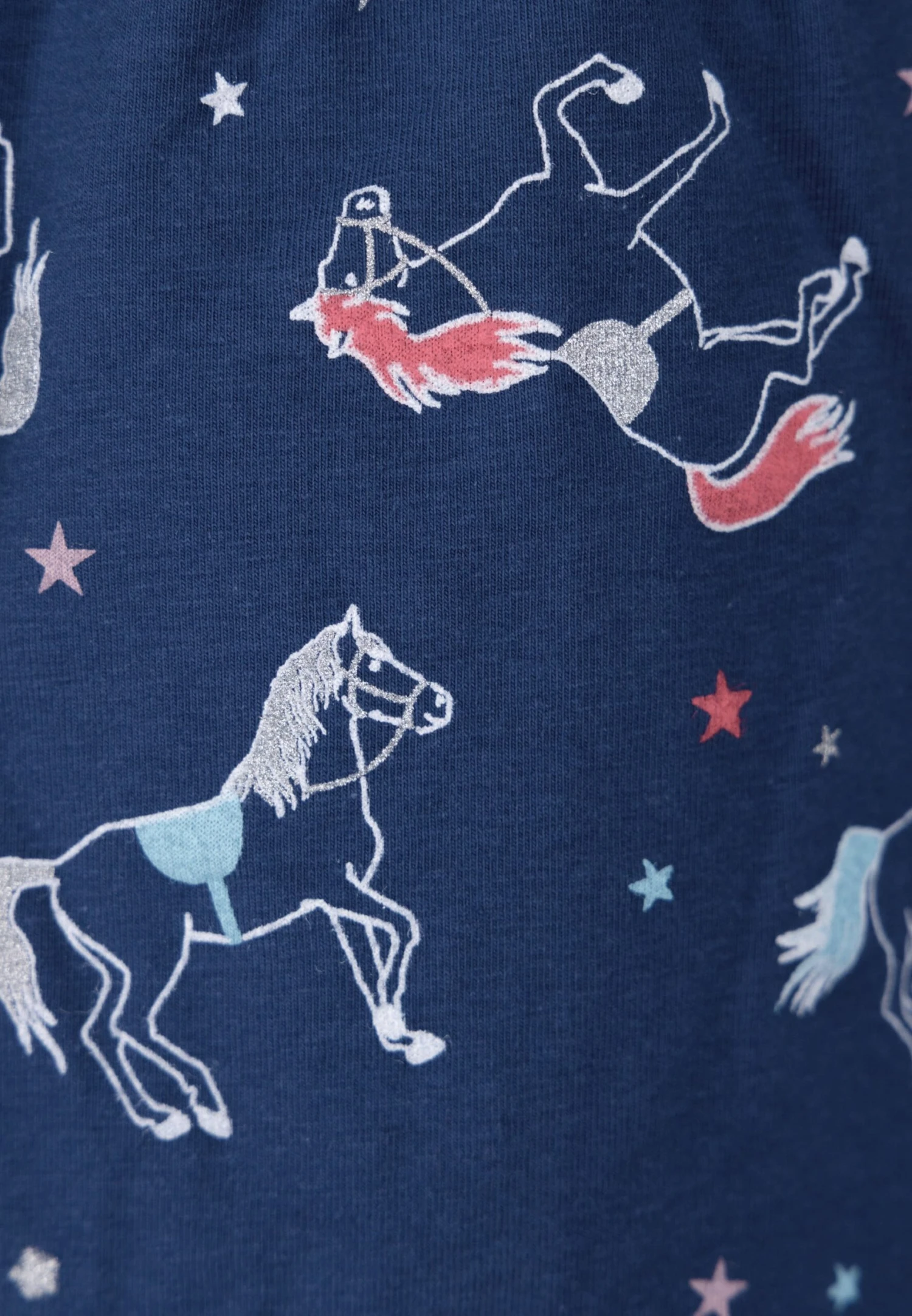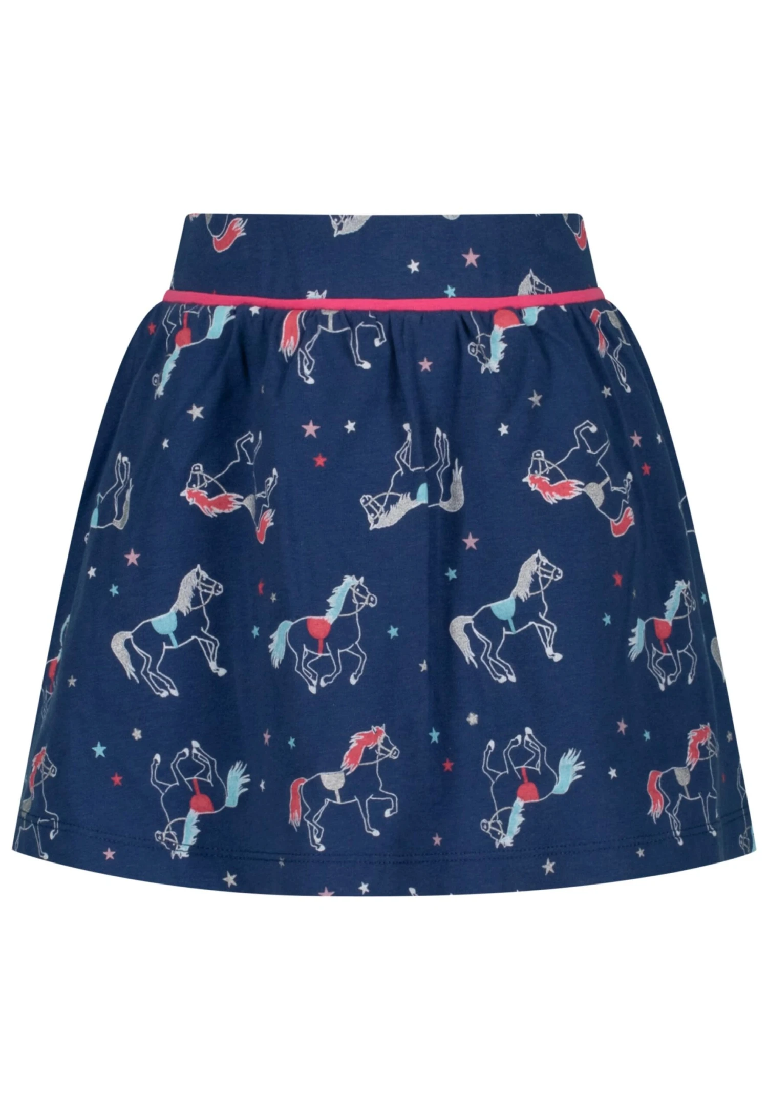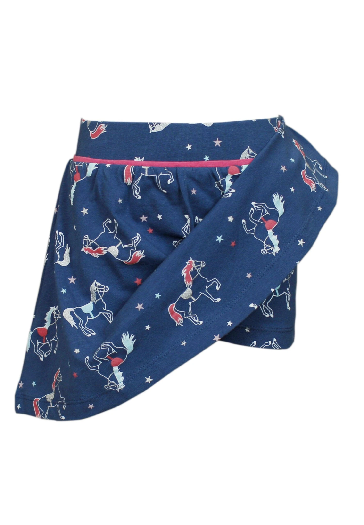 Der niedliche Mädchen-Sommerrock hat einen Allover-Pferde-Print. Silber glänzende Mähnen, Sattel und Zaumzeuge sind Eyecatcher auf dem unifarbenen Hintergrund, zahlreiche kleine bunte Sternchen sorgen für farbliche Abwechslung. Der breite Komfortbund kommt mit einer farblich abgestimmten Ziernaht. Der leicht ausgestellte, angesetzte Rockteil mit integrierter Radler sorgt für viel Bewegungsfreiheit! Die weiche Qualität aus einem Baumwoll Materialmix liegt angenehm auf der Haut. Dieser Skort ist ein sehr praktischer Alltagsbegleiter in tollen Mädchenfarben.