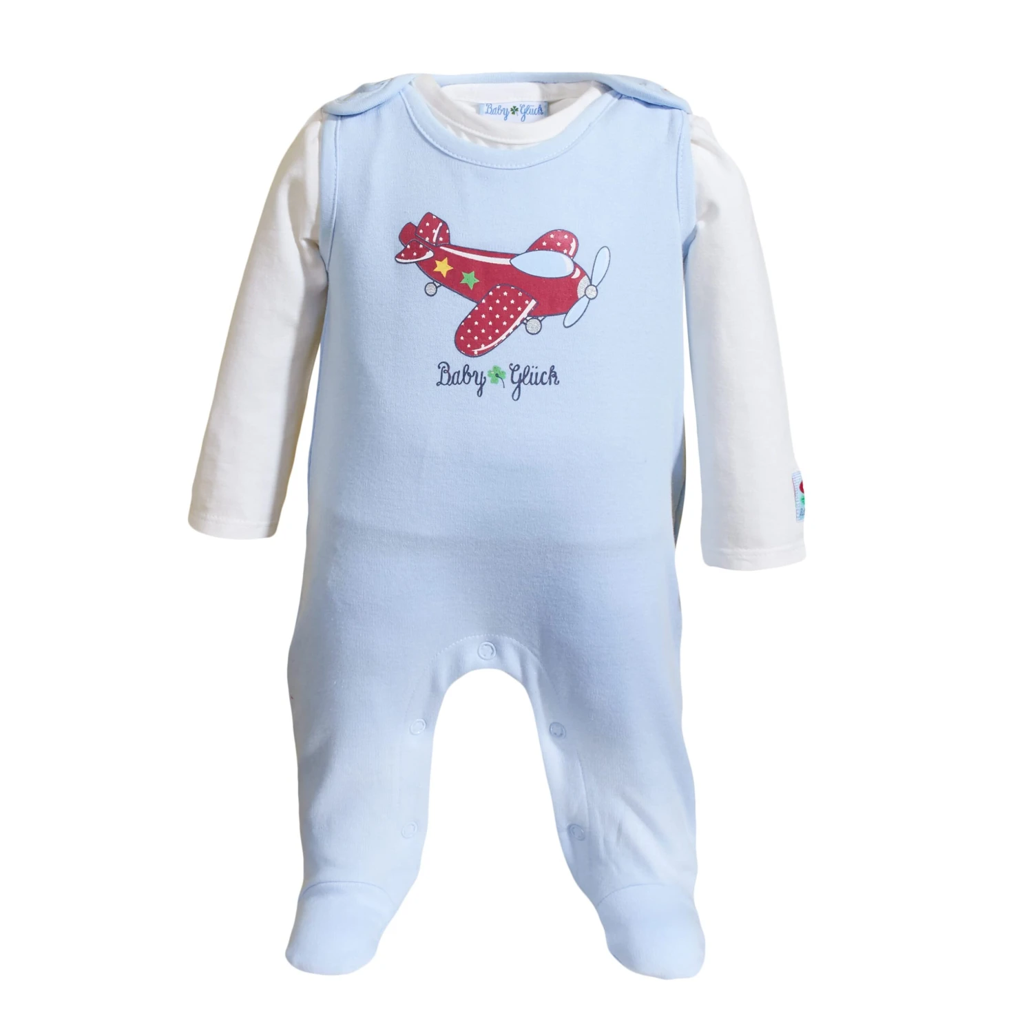 Niedliches Strampler-Set, bestehend aus bequemem einfarbigem Einteiler und weißem Longsleeve. Das coole bunte Flugzeug ist aufgedruckt und ein echter Hingucker. Praktische kleine Druckknöpfchen an Trägern und Beinen des Stramplers sowie am Halsausschnitt des Langarmshirts unterstützen sanft das Aus- und Anziehen. Artikel fällt kleiner aus. Bitte eine Nummer größer bestellen.