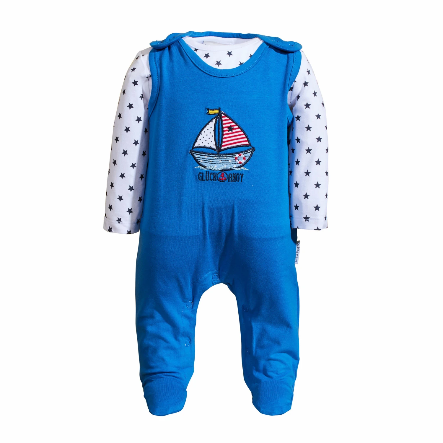 Süßer Strampler aus Bio-Baumwolle mit Fuß und passendem Oberteil für kleine Baby-Jungs. Der unifarbene Einteiler besticht durch sein maritimes Motiv. Das detailliert gestickte Segelboot ist ein niedlicher Hingucker, komplettiert wird das Motiv des Sets mit dem dazu passendem „Glück Ahoy“ Schriftzug. Das einfarbige Langarmshirt ist allover mit Sternchen bedruckt. Praktische kleine Druckknöpfchen im Schritt und auf der Schulter machen das An- und Ausziehen superleicht. Das Set eignet sich auch ideal als Geschenk zur Geburt, da es ein tolles Basic für die Erstausstattung ist. Artikel fällt kleiner aus. Bitte eine Nummer größer bestellen.
