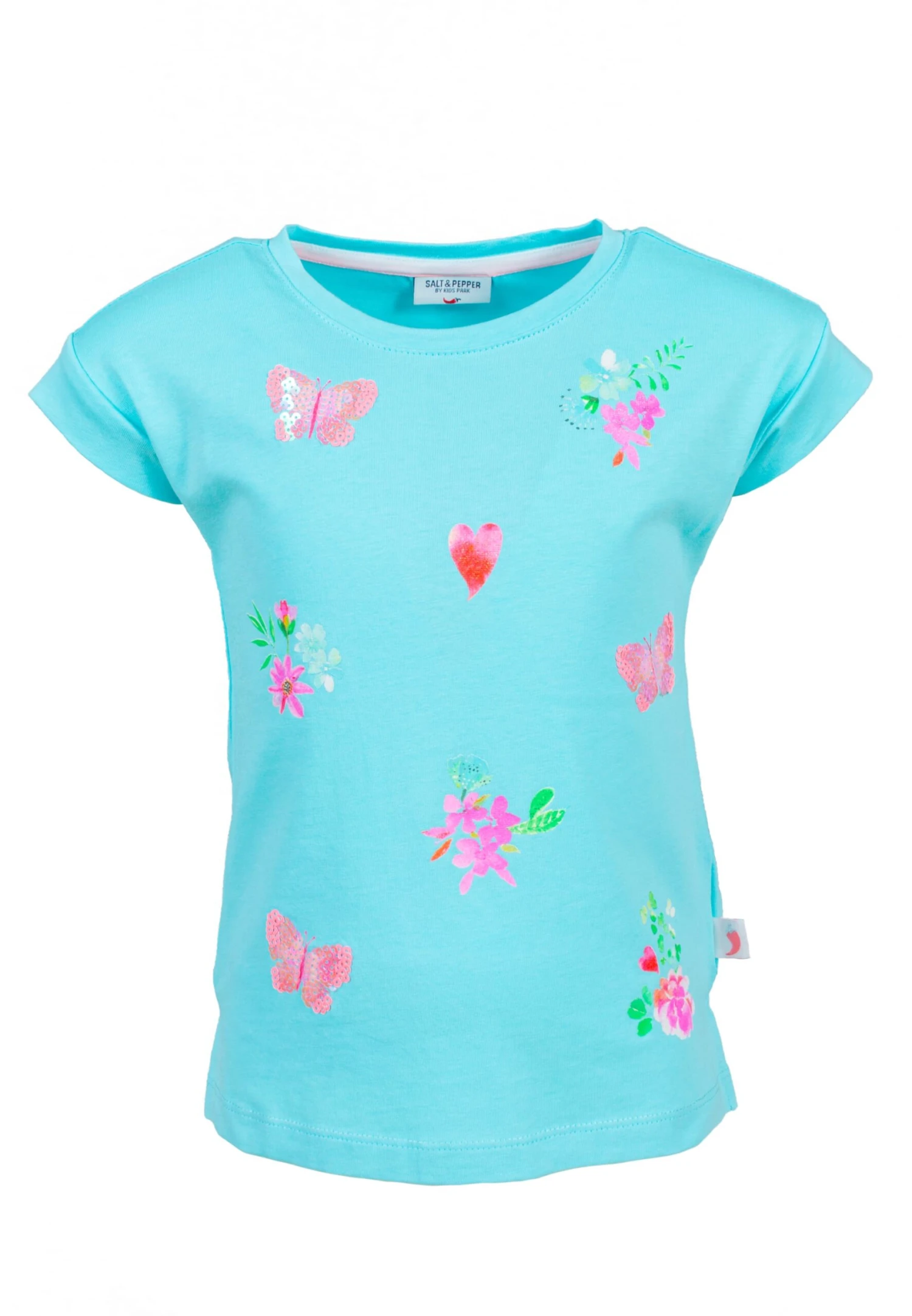 Süßes T-Shirt für kleine Mädchen mit Blumen und Schmetterling – Print und kurzen, gerafften Ärmeln. Die Motive sind zudem mit hochwertigen, festen Pailletten besetzt und über das komplette T-Shirt verteilt zu finden. Das Shirt lässt sich, durch seine Qualität aus Baumwolle angenehm tragen. Der Artikel fällt kleiner aus, bitte eine Nummer größer bestellen.
